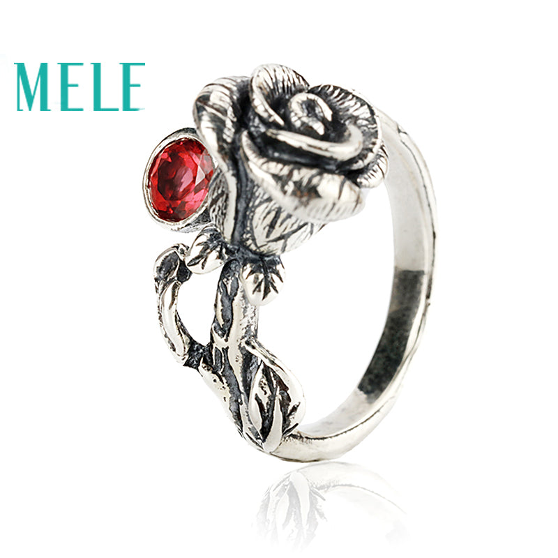 Natural Chinese Classical style silver 925 jewelry.Garnet Rose retro ring for women, Adjustable stereoscopic engraving,Glitterin